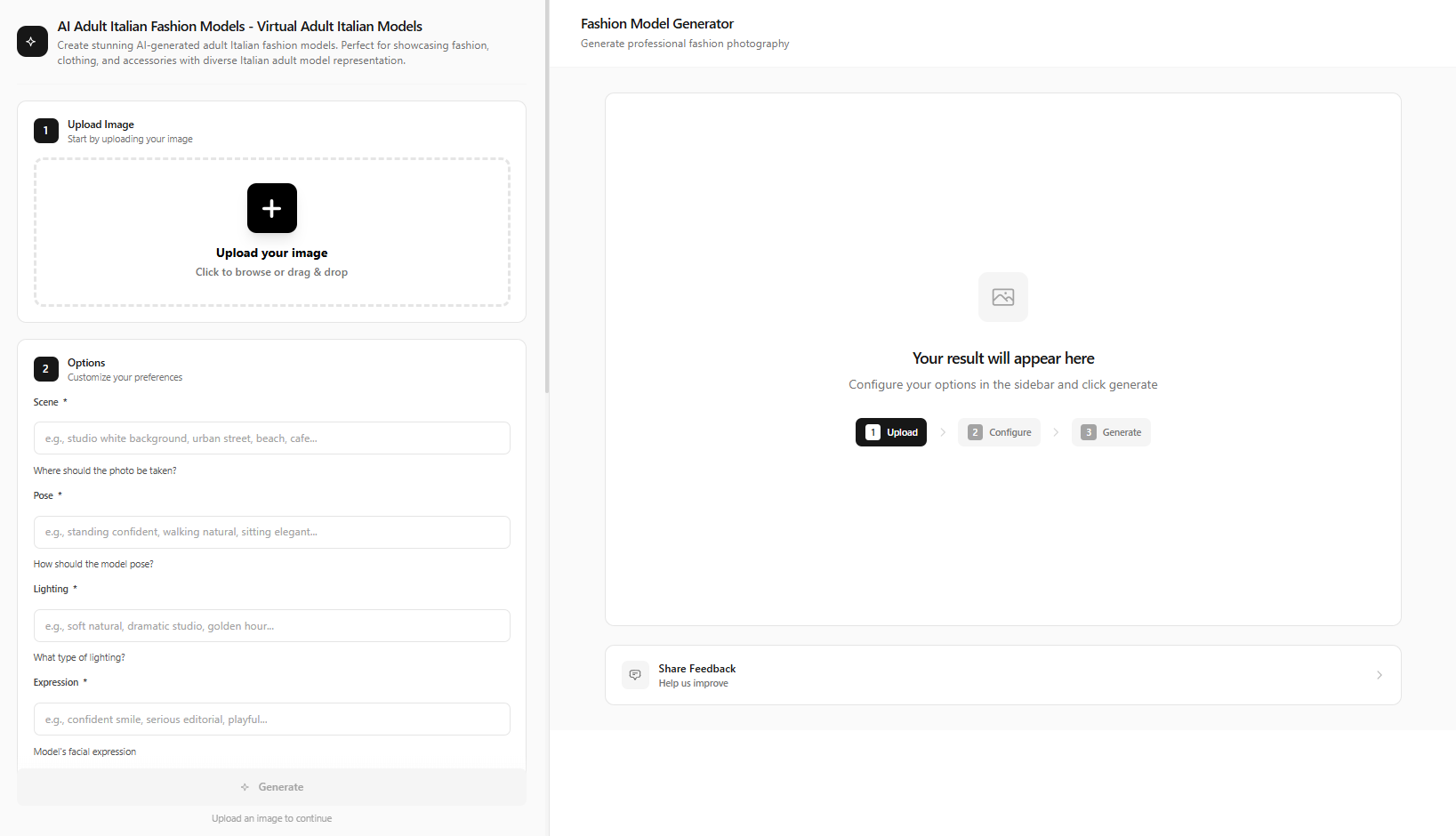 Navigate to /ai-fashion-models. Select a model type: young American, Korean, Indian, Mediterranean, East African, South Asian, Northern European, and more. Match the model to your target audience.