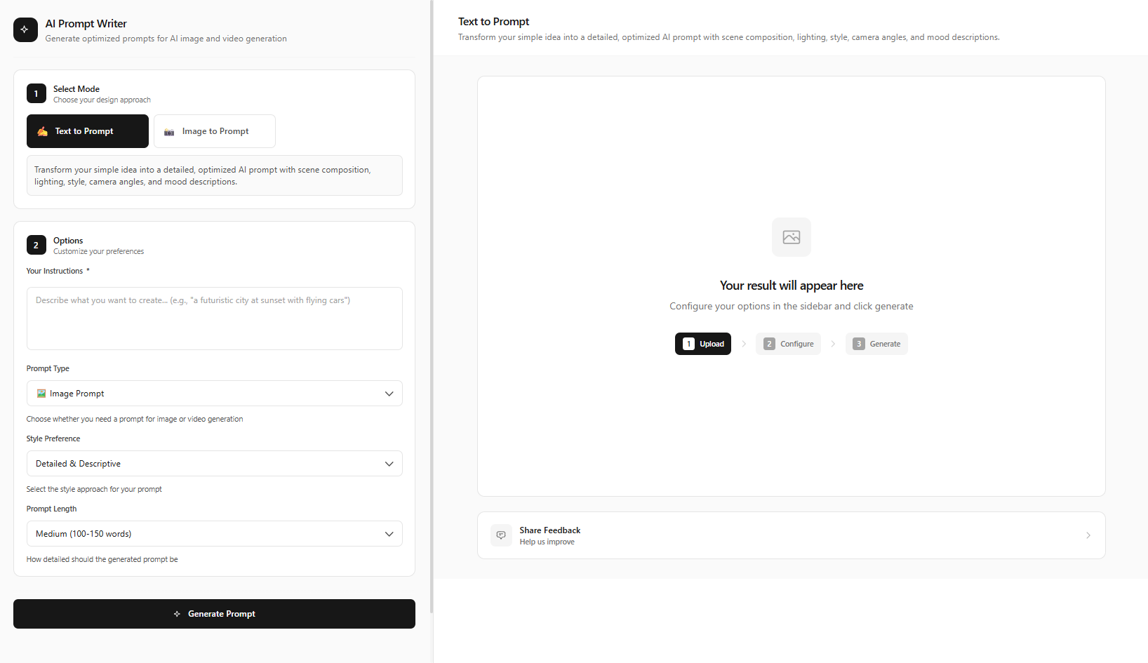 Use Image to Prompt mode if you have a reference image — upload it and click "Analyze & Generate" for an even more targeted prompt.