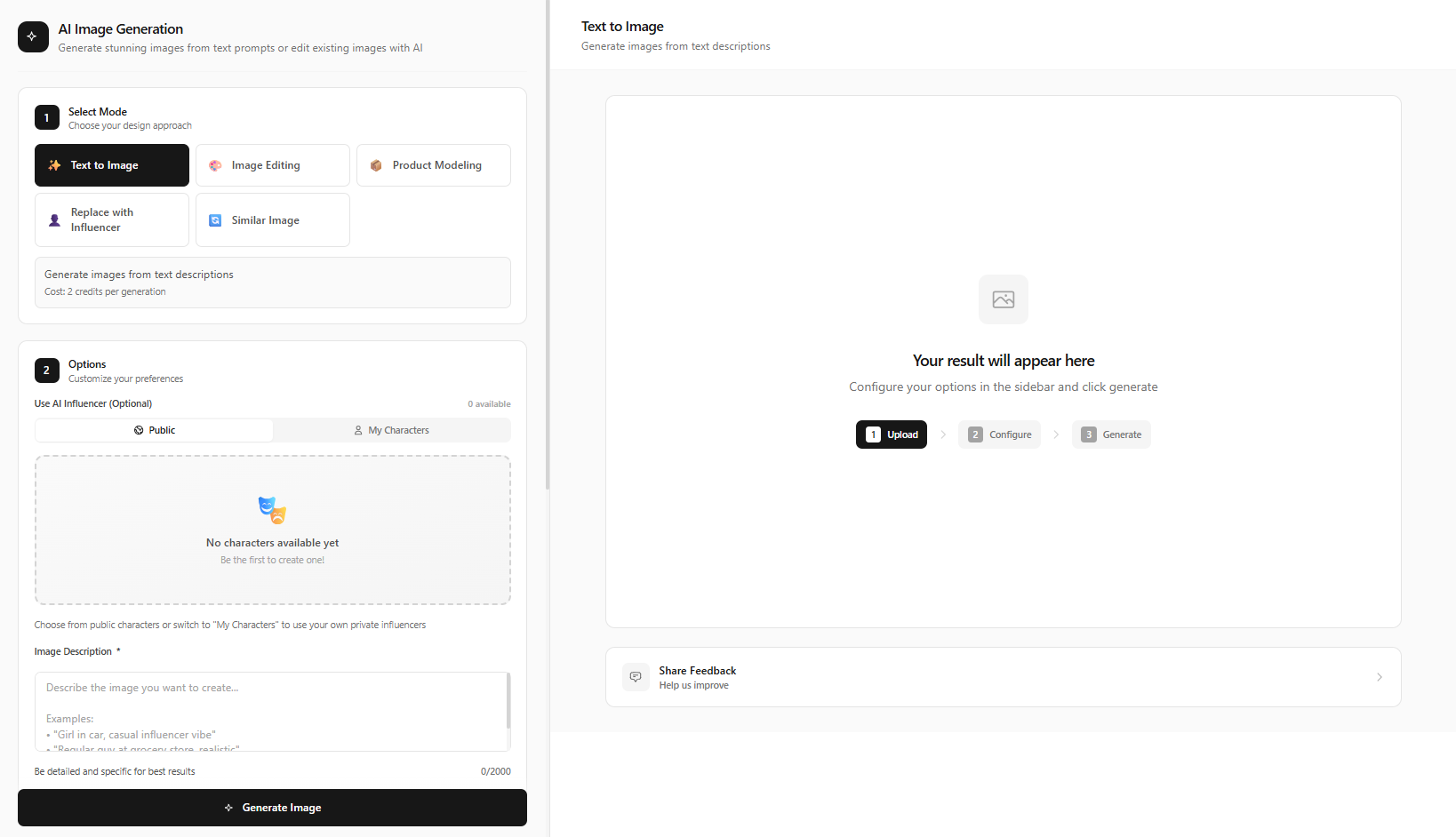 - Influencer Generator — Go to /influencer-generator/create. Create your character → "Generate Character". Use Image Generation → Replace with Influencer mode → upload your scene, apply the influencer → "Apply Influencer".